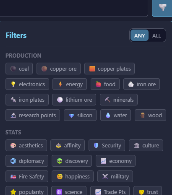 also added building list filters, a fancy popup widget with toggles for filtering by resources and city stats, as well as a filter style for [ANY/ALL] (notably the 'ALL' is a type of search requirement that will rarely find specific production combinations in the currently limited number of buildings, because by design the number of stat/resource combinations scales exponentially as each one is added, so 'any' is the default)
