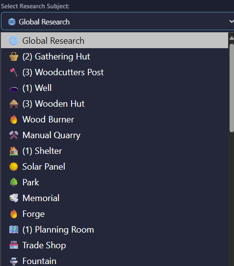 also added intuitive numbers to the research dropdown, such as (X)building name, where X is how many you have and is invisible if you don't have any, which serves as a mental shortcut for quickly parsing the list to see the most relevant buildings to select for research tech.