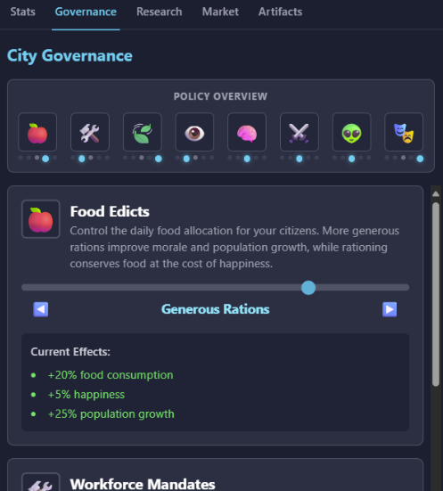 added government tab overview with fancy pips to see at a glance the entire policy, click the buttons to scroll through the list and highlight them (also scrolls game page outside of fullscreen for some stupid reason, that's a bug). It will seem like overkill but the overview icons might as well do 'something' if you click them, and it will also add frictionless scaling if the list of governance parameters becomes larger.